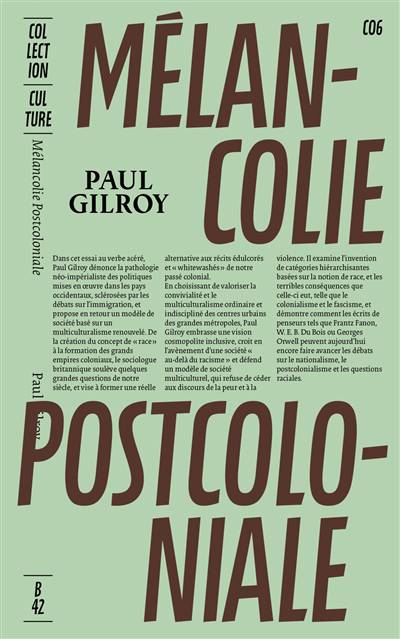 Dans cet essai au verbe acéré, Paul Gilroy dénonce la pathologie néo-impérialiste des politiques mises en œuvre dans les pays occidentaux, sclérosées par les débats sur l’immigration, et propose en retour un modèle de société basé sur un multiculturalisme renouvelé. De la création du concept de « race » à la formation des grands empires coloniaux, le sociologue britannique soulève quelques grandes questions de notre siècle, et vise à former une réelle alternative aux récits édulcorés et « whitewashés » de notre passé colonial. En choisissant de valoriser la convivialité et le cosmopolitanisme ordinaire et indiscipliné des centres urbains des grandes métropoles, Paul Gilroy embrasse une vision cosmopolite inclusive, croit en l’avènement d’une société « au-delà du racisme » et défend un modèle de société multiculturel, qui refuse de céder aux discours de la peur et à la violence. Il examine l’invention de catégories hiérarchisantes basées sur la notion de race, et les terribles conséquences que celle-ci eut, telle que le colonialisme et le fascisme, et démontre comment les écrits de penseurs tels que Frantz Fanon, W. E. B. Du Bois ou Georges Orwell peuvent aujourd’hui encore faire avancer les débats sur le nationalisme, le postcolonialisme et les questions raciales. Cette première traduction de Mélancolie post-coloniale ser accompagnée d’une préface inédite de l’auteur, apportant un regard contemporain sur les enjeux traités par le livre et faire écho aux luttes post-coloniales d’aujourd’hui, en recherche d’une pensée critique exigeante.
