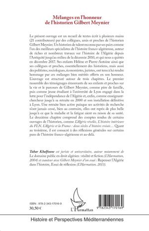 Le présent ouvrage est un recueil de textes écrit à plusieurs mains (21 contributeurs) par des collègues, amis et proches de l'historien Gilbert Meynier. Un historien de talent reconnu par ses pairs comme l'un des meilleurs spécialistes de l'histoire franco-algérienne, auteur de riches et nombreux travaux sur l'histoire de l'Algérie depuis l'Antiquité jusqu'au milieu de la décennie 2010, et qui nous a quittés en décembre 2017. Trois parties structurent cet ouvrage : des témoignages de ses enfants et proches, des comptes rendus de certains ouvrages, enfin des réflexions générales sur certains pans de l'histoire franco-algérienne et au-delà.