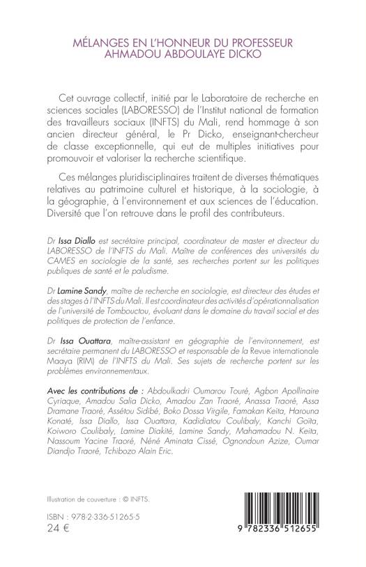 Cet ouvrage collectif, initié par le Laboratoire de recherche en sciences sociales (LABORESSO) de l'Institut national de formation des travailleurs sociaux (INFTS) du Mali, rend hommage à son ancien directeur général, le Pr Dicko, enseignant-chercheur de classe exceptionnelle, qui eut de multiples initiatives pour promouvoir et valoriser la recherche scientifique. Ces mélanges pluridisciplinaires traitent de diverses thématiques relatives au patrimoine culturel et historique, à la sociologie, à la géographie, à l'environnement et aux sciences de l'éducation. Diversité que l'on retrouve dans le profil des contributeurs.
