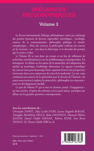 Ce volume III se veut un creuset et un lieu de ralliement de recherches transdisciplinaires sur les problématiques contemporaines. En témoignent les débats sur les enjeux de la monarchie, de l'adaptation des médias au numérique, l'esthétique alimentaire. La vigueur scientifique des auteurs tient pour beaucoup à leurs capacités d'ouvrir des perspectives innovantes dans cette conjoncture de crises de la modernité. Les uns nous conduisent aux sources de la spiritualité pour le devenir de l'humain ; les autres nous invitent à explorer les pistes de la « philosophie éco-citoyenne » pour un développement durable.