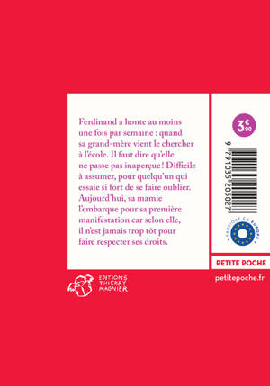 Ferdinand a honte au moins une fois par semaine : quand sa grand-mère vient le chercher à l'école. Il faut dire qu'elle ne passe pas inaperçue ! Difficile à assumer, pour quelqu'un qui essaie si fort de se faire oublier. Aujourd'hui, sa mamie l'embarque pour sa première manifestation car selon elle, il n'est jamais trop tôt pour faire respecter ses droits.