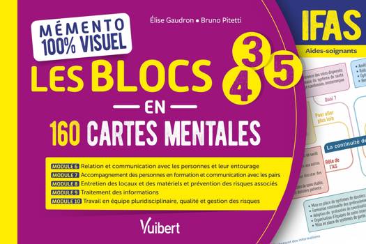 Avec ses 160 mind map rédigées par des formateurs en IFAS, ce petit livre propose de faire un tour exhaustif du bloc 3 « Information et accompagnement des personnes et de leur entourage, des professionnels et des apprenants » ; du bloc 4 « Entretien de l’environnement immédiat de la personne et des matériels liés aux activités en tenant compte du lieu et des situations d’intervention » et du bloc 5 « Travail en équipe pluriprofessionnelle et traitement des informations liées aux activités de soins, à la qualité/gestion des risques » :
