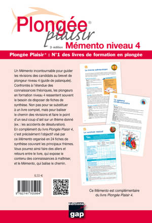 Ce mémento reprend les notions essentielles à maîtriser pour obtenir le brevet de niveau 4, qui permet de devenir guide et d'encadrer un groupe de plongeurs. Il comprend 24 fiches regroupant les principales connaissances théoriques du programme : la conduite de palanquée, le monde subaquatique, l'orientation, la flottabilité, la consommation d'air et l'autonomie, etc.