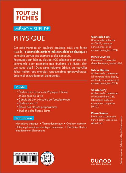 Cet aide-mémoire en couleurs présente, sous une forme visuelle, l'essentiel des notions indispensables en physique à connaître en vue des examens et des concours. Regroupés par thèmes, plus de 400 schémas et photos sont commentés pour permettre aux étudiants de réviser d'un seul coup d'oeil ! Dans cette troisième édition, de nouvelles fiches ont été ajoutées (gaz et phases condensées dans la partie Thermodynamique, postulat de Bohr et atome d'hydrogène dans la partie Ondes et matière, modèle de Drude, instruments de mesure, etc. dans la partie Electrocinétique).