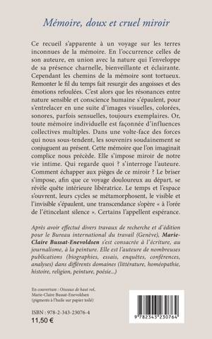 Ce recueil s’apparente à un voyage sur les terres inconnues de la mémoire. En l’occurrence celles de son auteure, en union avec la nature qui l’enveloppe de sa présence charnelle, bienveillante et éclairante. Cependant les chemins de la mémoire sont tortueux. Remonter le fil du temps fait resurgir des angoisses et des émotions refoulées. C’est alors que les résonances entre nature sensible et conscience humaine s’épaulent, pour s’entrelacer en une suite d’images visuelles, colorées, sonores, parfois sensuelles, toujours exemplaires. Or, toute mémoire individuelle est façonnée d’influences collectives multiples. Dans une volte-face des forces qui nous sous-tendent, les souvenirs soudainement se conjuguent au présent. Cette mémoire que l’on imaginait complice nous précède. Elle s’impose miroir de notre vie intime. Qui regarde quoi ? s’interroge l’auteure. Comment échapper aux pièges de ce miroir ?