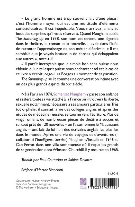 « Le grand homme est trop souvent fait d’une pièce ; c’est l’homme moyen qui est une multitude d’éléments contradictoires. Il est inépuisable. Vous n’arrivez jamais au bout des surprises qu’il vous réserve ». Quand Maugham publie The Summing up en 1938, son nom est devenu une légende dans le théâtre, le roman et la nouvelle. Il avait dans l’idée de raconter l’apprentissage de son métier d’écrivain. « Il me semblait que je voyais beaucoup de choses qui échappaient aux autres », note-t-il.