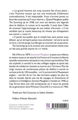 « Il paraît incroyable que le simple bon sens puisse nous éblouir, qu’un tel esprit puisse nous enchanter : tel est le cas de ce livre » écrivit Jorge-Luis Borges au moment de sa parution. The Summing up se lit comme une conversation intime avec un des plus grands esprits du XXe siècle.