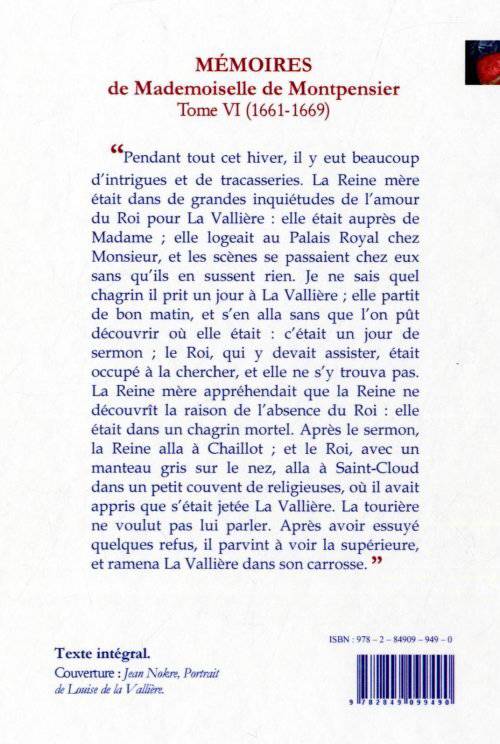 « Pendant tout cet hiver, il y eut beaucoup d'intrigues et de tracasseries. La Reine mère était dans de grandes inquiétudes de l'amour du Roi pour La Vallière : elle était auprès de Madame ; elle logeait au Palais Royal chez Monsieur, et les scènes se passaient chez eux sans qu'ils en sussent rien. Je ne sais quel chagrin il prit un jour à La Vallière ; elle partit de bon matin, et s'en alla sans que l'on pût découvrir où elle était : c'était un jour de sermon ; le Roi, qui y devait assister, était occupé à la chercher, et elle ne s'y trouva pas. La Reine mère appréhendait que la Reine ne découvrît la raison de l'absence du Roi : elle était dans un chagrin mortel. Après le sermon, la Reine alla à Chaillot ; et le Roi, avec un manteau gris sur le nez, alla à Saint-Cloud dans un petit couvent de religieuses, où il avait appris que s'était jetée La Vallière. La tourière ne voulut pas lui parler. Après avoir essuyé quelques refus, il parvint à voir la supérieure, et ramena La Vallière dans son carrosse. »