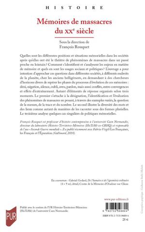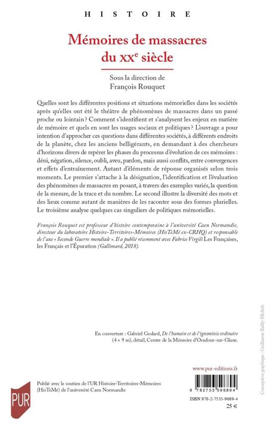 Quelles sont les différentes positions et situations mémorielles dans les sociétés après qu’elles ont été le théâtre de phénomènes de massacres dans un passé proche ou lointain ? Comment s’identifient et s’analysent les enjeux en matière de mémoire et quels en sont les usages sociaux et politiques ? L’ouvrage a pour intention d’approcher ces questions dans différentes sociétés, à différents endroits de la planète, chez les anciens belligérants, en demandant à des chercheurs d’horizons divers de repérer les phases du processus d’évolution de ces mémoires : déni, négation, silence, oubli, aveu, pardon, mais aussi conflits, entre convergences et effets d’entraînement. Autant d’éléments de réponse organisés selon trois moments. Le premier s’attache à la désignation, l’identification et l’évaluation des phénomènes de massacres en posant, à travers des exemples variés, la question de la mesure, de la trace et du nombre. Le second illustre la diversité des mots et des lieux comme autant de manières de les raconter sous des formes plurielles. Le troisième analyse quelques cas singuliers de politiques mémorielles.