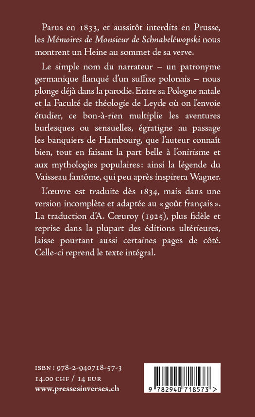 Une petite oeuvre étincelante d’humour, où Heine revêt l’identité d’un jeune hobereau polonais pour tailler en pièces les conventions morales et religieuses, le règne de l’argent-roi... et le genre même des « mémoires », qu’il clôt ici sur une pirouette au beau milieu du Livre Premier. Parus en 1833, et aussitôt interdits en Prusse, les Mémoires de Monsieur de Schnabeléwopski nous montrent un Heine au sommet de sa verve. Le simple nom du narrateur – un patronyme germanique flanqué d’un suffixe polonais – nous plonge déjà dans la parodie. Entre sa Pologne natale et la Faculté de théologie de Leyde où on l’envoie étudier, ce bon-à-rien multiplie les aventures burlesques ou sensuelles, égratigne au passage les banquiers de Hambourg, que l’auteur connaît bien, tout en faisant la part belle à l’onirisme et aux mythologies populaires : ainsi la légende du Vaisseau fantôme, qui peu après inspirera Wagner. L’oeuvre est traduite dès 1834, mais dans une version incomplète et adaptée au « goût français ». La traduc-tion d’A. Coeuroy (1925), plus fidèle et reprise dans la plupart des éditions ultérieures, laisse pourtant certaines pages de côté. Celle-ci reprend le texte intégral.