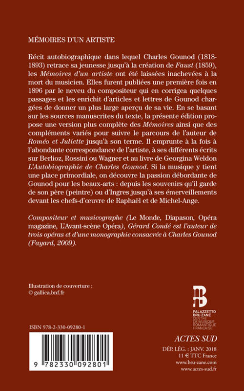 Récit autobiographique dans lequel Charles Gounod (1818-1893) retrace sa jeunesse jusqu'à la création de «Faust »(1859), les «Mémoires d'un artiste »ont été laissées inachevées à la mort du musicien. Elles furent publiées une première fois en 1896 par le neveu du compositeur qui en corrigea quelques passages et les enrichit d'articles et lettres de Gounod chargées de donner un plus large aperçu de sa vie. En se basant sur les sources manuscrites du texte, la présente édition propose une version plus complète des «Mémoires »ainsi que des compléments variés pour suivre le parcours de l'auteur de «Roméo et Juliette »jusqu'à son terme. Il emprunte à la fois à l'abondante correspondance de l'artiste, à ses différents écrits sur Berlioz, Rossini ou Wagner et au livre de Georgina Weldon «L'Autobiographie de Charles Gounod». Si la musique y tient une place primordiale, on découvre la passion débordante de Gounod pour les beaux-arts : depuis les souvenirs qu'il garde de son père (peintre) ou d'Ingres jusqu'à ses émerveillements devant les chefs-d'oeuvre de Raphaël et de Michel-Ange.
