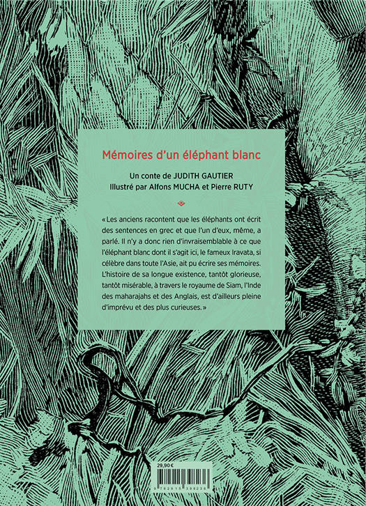 « Les anciens racontent que les éléphants ont écrit des sentences en grec et que l'un d'eux, même, a parlé. Il n'y a donc rien d'invraisemblable à ce que l'éléphant blanc dont il s'agit ici, le fameux Iravata, si célèbre dans toute l'Asie, ait pu écrire ses mémoires. L'histoire de sa longue existence, tantôt glorieuse, tantôt misérable, à travers le royaume de Siam, l'Inde des maharajahs et des Anglais, est d'ailleurs pleine d'imprévu et des plus curieuses. » Judith GAUTIER Réédition d'un conte paru en 1894, avec les illustrations d'Alfons Mucha et Pierre Ruty 35 illustrations noir dont 7 gravures pleine page de Mucha 5 aquarelles inédites 29 en-têtes de Pierre Ruty Romancière célèbre à la fin du 19eâsiècle, à ce jour presque totalement oubliée, Judith Gautier (1845-1917) a marqué son temps par ses récits, véritables odes à l’ailleurs. Elle fut la première femme membre du jury de l’académie Goncourt. Universellement reconnu, le tchèque Alfons Mucha (1860–1939) renouvela l’art de l’affiche imprimée en couleurs. Il fut également, on le sait moins, illustrateur de livres, ce qu’il démontre magistralement dans "Mémoires d'un éléphant blanc". Pierre Ruty (1868-1937) dessina les en-têtes des chapitres de "Mémoires d'un éléphant blanc", en parfait accord avec le travail de Mucha. Il participa de manière déterminante à l'émergence de l'Art Nouveau.