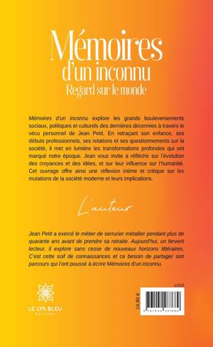 Mémoires d'un inconnu explore les grands bouleversements sociaux, politiques et culturels des dernières décennies à travers le vécu personnel de Jean Petit. En retraçant son enfance, ses débuts professionnels, ses relations et ses questionnements sur la société, il met en lumière les transformations profondes qui ont marqué notre époque. Jean vous invite à réfléchir sur l'évolution des croyances et des idées, et sur leur influence sur l'humanité. Cet ouvrage offre ainsi une réflexion intime et critique sur les mutations de la société moderne et leurs implications.