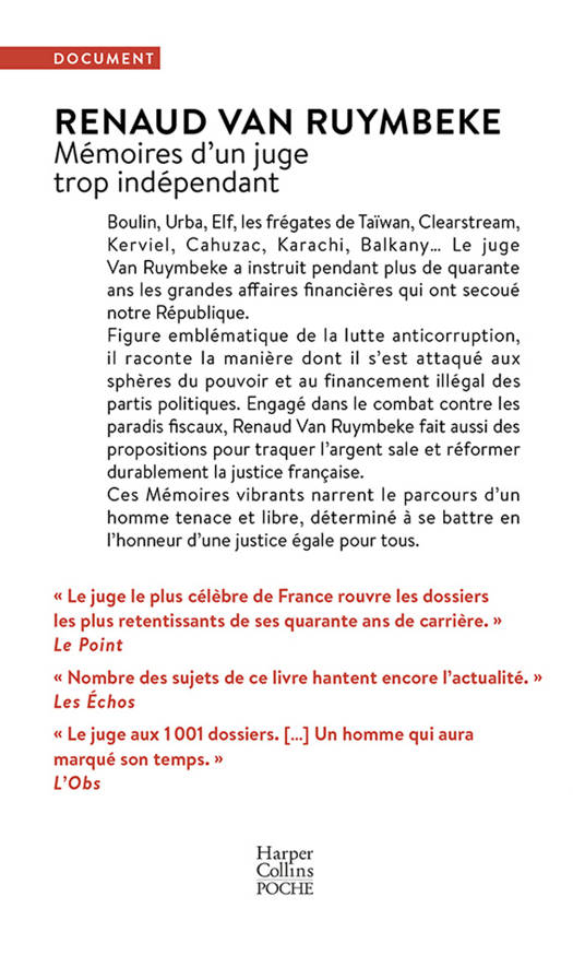 Boulin, Urba, Elf, les frégates de Taïwan, Clearstream, Kerviel, Cahuzac, Karachi, Balkany… Le juge Van Ruymbeke a instruit pendant plus de quarante ans les grandes affaires financières qui ont secoué notre République. Figure emblématique de la lutte anticorruption, il raconte la manière dont il s’est attaqué aux sphères du pouvoir et au financement illégal des partis politiques. Engagé dans la lutte contre les paradis fiscaux, Renaud Van Ruymbeke fait aussi des propositions pour traquer l’argent sale et réformer durablement la justice française. Ces Mémoires vibrants narrent le parcours d’un homme tenace et libre, déterminé à se battre en l’honneur d’une justice égale pour tous.