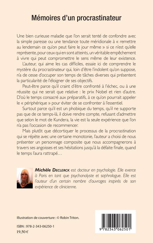 Non, cela n'a rien de drôle, la procrastination, même si on a pu parfois s'en amuser. C'est pourquoi Michèle Declerck a choisi, plutôt que d'en décrire une fois de plus les manifestations, de prêter sa parole au procrastinateur, celui qui, à force de ne rien faire de ses journées, finit par oublier l'avertissement de Kundera selon lequel la vie est « la seule expérience qu'on ne peut recommencer 2 fois ». Comment pourrait-il écrire ses Mémoires, lui qui en a si peu