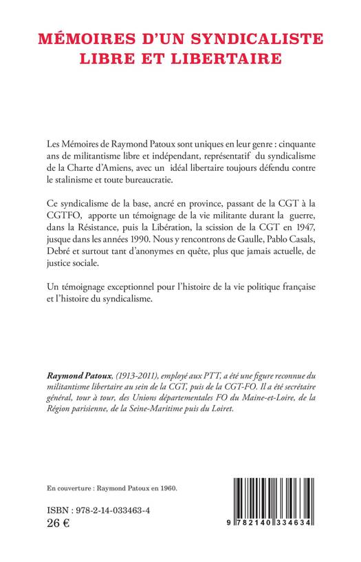 Les Mémoires de Raymond Patoux sont uniques en leur genre: cinquante ans de militantisme libre et indépendant, représentatif du syndicalisme de la Charte d'Amiens, avec un idéal libertaire toujours défendu contre le stalinisme et toute bureaucratie. Ce syndicalisme de la base, ancré en province, passant de la CGT à la CGTFO, apporte un témoignage de la vie militante durant la guerre, dans la Résistance, puis la Libération, la scission de la CGT en 1947, jusque dans les années 1990. Nous y rencontrons de Gaulle, Pablo Casals, Debré et surtout tant d'anonymes en quête, plus que jamais actuelle, de justice sociale. Un témoignage exceptionnel pour l'histoire de la vie politique française et l'histoire du syndicalisme.