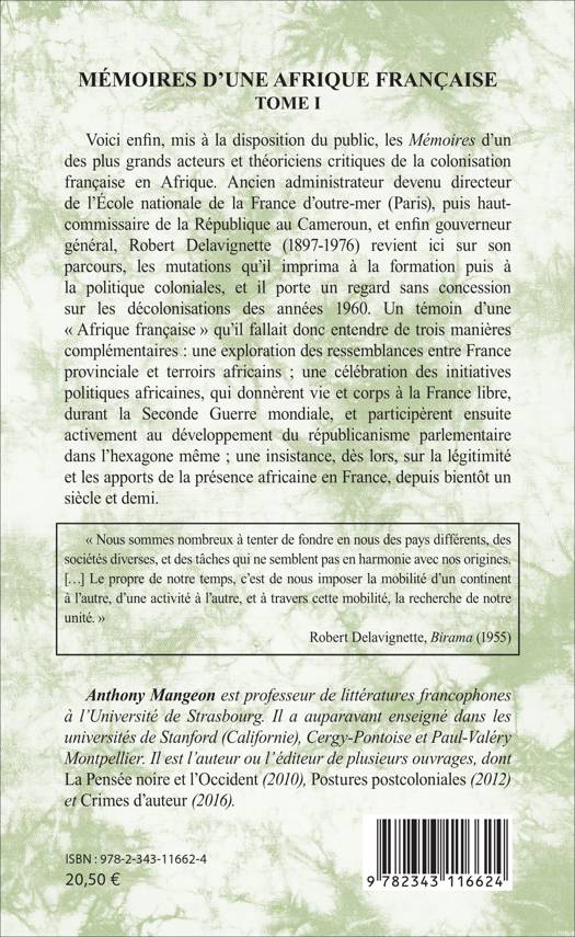 Voici enfin, mis à la disposition du public, les Mémoires d'un des plus grands acteurs et théoriciens critiques de la colonisation française en Afrique. Ancien administrateur devenu directeur de l'Ecole nationale de la France d'outre-mer (Paris), puis haut-commissaire de la République au Cameroun, et enfin gouverneur général, Robert Delavignette (1897-1976) revient ici sur son parcours, les mutations qu'il imprima à la formation puis à la politique coloniales, et il porte un regard sans concession sur les décolonisations des années 1960.