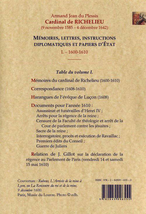 Le volume comprend : Mémoires du cardinal de Richelieu (1600-1610) Correspondance de l'évêque de Luçon (1608-1610) Harangues de l'évêque de Luçon (1608) Documents pour l'année 1610 : Assassinat et funérailles d'Henri IV ; Arrêts pour la régence de la reine ; Affaire des jésuites ; Sacre de la reine ; interrogatoire, procès et exécution de Ravaillac ; premiers édits du Conseil ; Guerre de Juliers. Relation de Javques Gillot sur la déclaration de la régence.
