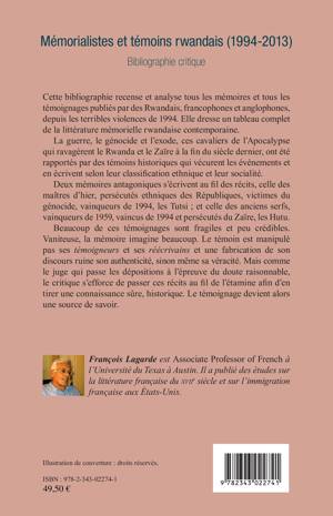 Cette bibliographie recense et analyse tous les mémoires et tous les témoignages publiés par des Rwandais, francophones et anglophones, depuis les terribles violences de 1994. Elle dresse un tableau complet de la littérature mémorielle rwandaise contemporaine.