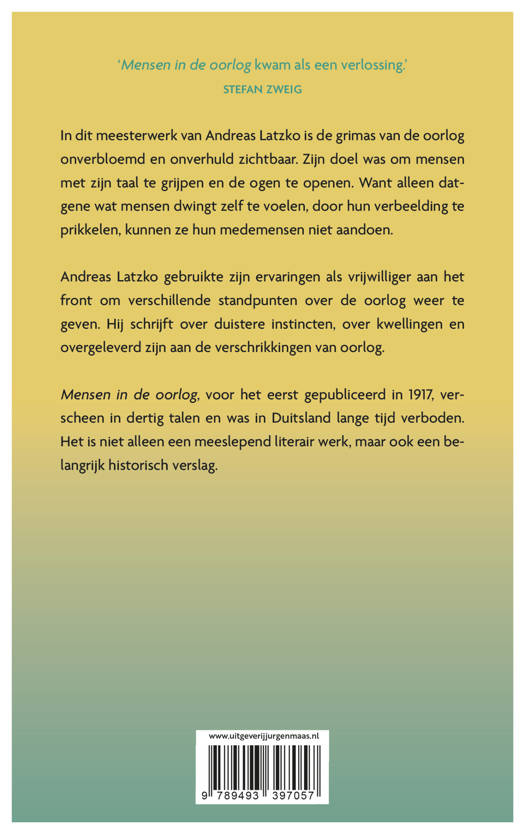 Andreas Latzko (Boedapest, 1876 – Amsterdam, 1943) was een Oostenrijks-Hongaarse schrijver. In 1915 ging hij vrijwillig naar het front om met autoriteit over de oorlog te kunnen schrijven. In 1916 stortte hij aan het Isonzofront fysiek en mentaal in. Om aan te sterken vertrok hij naar Davos en schreef daar de eerste hoofdstukken van zijn bekendste werk 'Mensen in de oorlog'. In 1920 verhuisde hij naar Salzburg, waar hij goed bevriend raakte met Stefan Zweig. Vanaf 1931 woonde hij met zijn vrouw en zoon in Amsterdam, waar hij in 1943 overleed.