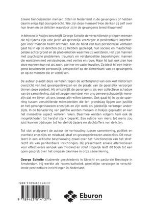 Enkele tienduizenden mensen zitten in Nederland in de gevangenis of hebben daarin enige tijd doorgebracht. Wie zijn deze mensen? Hoe denken zij zelf over hun leven en de delicten waardoor zij in de gevangenis terechtkwamen? In Mensen in hokjes beschrijft George Scholte de verschillende groepen mensen die hij tijdens zijn vele jaren als geestelijk verzorger in penitentiaire inrichtingen voor mannen heeft ontmoet. Aan de hand van hun persoonlijke verhalen gaat hij in op de delicten die zij hebben gepleegd, hun sociale en maatschappelijke achtergrond en de problematiek waarmee zij worstelen. Het zijn mannen met psychische problemen, trauma’s en verstandelijke beperkingen; mannen die worstelen met verslavingen, met verlies en rouw. Maar hij laat ook zien hoe deze mannen hun rol als zoon, partner en vader invullen. Zo biedt hij een indringend beschreven persoonlijk perspectief op de binnenkant van de gevangenis en op de mensen die er verblijven. De auteur plaatst deze verhalen tegen de achtergrond van een kort historisch overzicht van het gevangeniswezen en de plaats van de geestelijk verzorger binnen deze context. Hij omschrijft de gevangenis als een collectieve schaduw van de samenleving, dat wil zeggen een deel van ons gemeenschappelijk mens-zijn dat we liever uit ons bewustzijn willen bannen. Ook gaat hij in op de spanning tussen verschillende mensbeelden die ten grondslag liggen aan justitie en het gevangeniswezen enerzijds en zijn werk als geestelijk verzorger anderzijds. In de benadering van justitie worden mensen in hokjes geplaatst en kan het menselijke aspect verloren raken. Daarmee worden volgens hem ook de mogelijkheden tot herstel sterk beperkt. Een relatie van mens tot mens zou juist kunnen bijdragen tot herstel bij daders en slachtoffers van delicten. Tot slot analyseert de auteur de verhouding tussen samenleving, politiek en overheid enerzijds en misdaad, straf en gevangeniswezen anderzijds. Dit resulteert in een kritische beschouwing zowel over het functioneren van het strafrecht als van penitentiaire inrichtingen. Hij presenteert enkele alternatieven voor effectievere aanpak van misdaad en straf. Hopelijk leidt dit boek tot een open gesprek over het omgaan daarmee in onze samenleving. George Scholte studeerde geschiedenis in Utrecht en pastorale theologie in Amsterdam. Hij werkte als rooms-katholiek geestelijke verzorger in verschillende penitentiaire inrichtingen in Nederland.