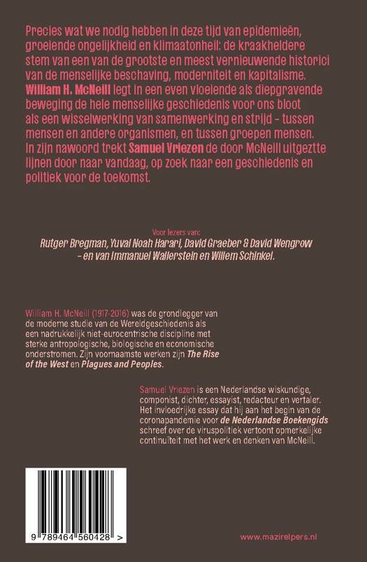 Precies wat we nodig hebben in deze tijd van epidemieën, groeiende ongelijkheid en klimaatonheil: de kraakheldere stem van een van de grootste en meest vernieuwende historici van de menselijke beschaving, moderniteit en kapitalisme. William H. McNeill legt in een even vloeiende als diepgravende beweging de hele menselijke geschiedenis voor ons bloot als een wisselwerking van samenwerking en strijd – tussen mensen en andere organismen, en tussen groepen mensen. In zijn nawoord trekt Samuel Vriezen de door McNeill uitgezette lijnen door naar vandaag, op zoek naar een geschiedenis en politiek voor de toekomst.