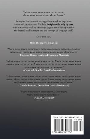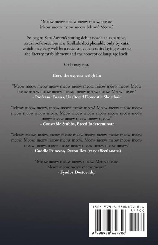 So begins Sam Austen's searing debut novel: an expansive, stream-of-consciousness fusillade decipherable only by cats, which may very well be a raucous, cogent satire laying waste to the literary establishment and the concept of language itself.