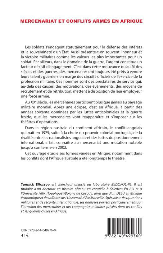 Les soldats s'engagent statutairement pour la défense des intérêts et la souveraineté d'un Etat. Aussi présente-t-on souvent l'honneur et la victoire militaires comme les valeurs les plus importantes pour un soldat. Par ailleurs, dans le domaine de la guerre, l'argent constitue un facteur décisif d'engagement. C'est dans cette mouvance qu'au fil des siècles et des guerres, des mercenaires ont toujours été prêts à vendre leurs talents guerriers en marge des circuits officiels de l'exercice de la profession militaire. Ces hommes sont des prestataires de service qui, au-delà des causes, des motivations, des événements, des moyens de recrutement et de rétribution, mettent à disposition de leur employeur une force armée. Au XXe siècle, les mercenaires participent plus que jamais au paysage militaire mondial. Après une éclipse, c'est en Afrique, à partir des années soixante dominées par les luttes anticoloniales et la guerre froide, que les mercenaires vont réapparaître et s'imposer sur les théâtres d'opérations. Dans la région australe du continent africain, le conflit angolais qui naît en 1975, suite à la chute du pouvoir colonial portugais, de la rivalité entre les nationalistes angolais et des luttes de positionnement international, a fait connaître au mercenariat une mutation notable jusqu'à son terme en 2002. Cet ouvrage étudie ses formes variées en Afrique, notamment dans les conflits dont l'Afrique australe a été longtemps le théâtre.