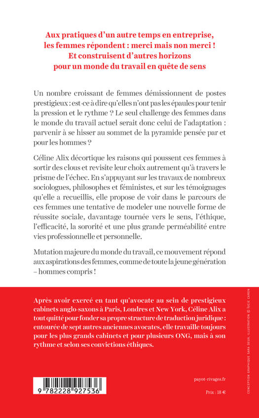 Un nombre croissant de femmes démissionnent de poste prestigieux ; est-ce à dire qu'elles n'ont pas les épaules pour tenir la pression et le rythme ? Le seul challenge des femmes dans le monde du travail actuel serait donc celui de l'adaptation : parvenir à se hisser au sommer de la pyramide par et pour les hommes ? Céline Adix décortique les raisons qui poussent ces femmes à sortir des clous et revisite leur choix autrement qu'à travers le prisme de l'échec. En s'appuyant sur les travaux de nombreux sociologues, philosophes et féministes, et sur les témoignages qu'elle a recueillis, elle propose de voir dans le parcours de ces femmes une tentative de modeler une nouvelle forme de réussite sociale, davantage tournée vers le sens, l'éthique, l'efficacité, la sororité et une plus grande perméabilité entre vie professionnelle et personnelle. Mutation majeure du monde du travail, ce mouvement répond aux aspiration des femmes comme toute la jeune génération- hommes compris !