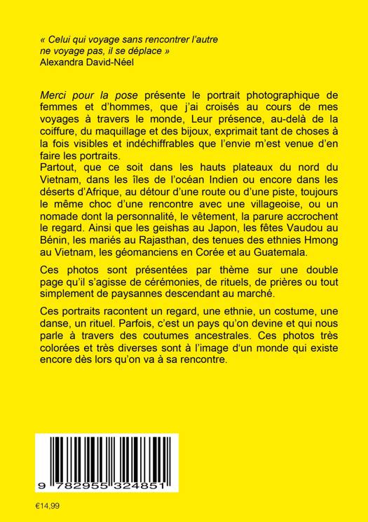 Merci pour la pose présente le portrait photographique de femmes et d'hommes, que j'ai croisés au cours de mes voyages à travers le monde. Leurs présence, au-delà de la coiffure, du maquillage et des bijoux, exprimait tant de choses à la fois visibles et indéchiffrables que l'envie m'est venu d'en faire les portraits. Partout, que ce soit dans les hauts plateaux du nord du Vietnam, dans les iles de l'océan indien ou encore dans les déserts d'Afrique, au détour d'une route ou d'une piste, toujours le même choc d'une rencontre avec une villageoise, ou un nomade dont la personnalité, le vêtement, la parure accrochent le regard. Ces portraits sont présentés par thème sur une double page qu'il s'agisse de cérémonies, de prières ou tout simplement de paysannes descendant au marché. Ils racontent un regard, une ethnies, un costume, une danse, un rituel. Parfois, c'est un pays qu'on devine et qui nous parle à travers des coutumes ancestrales. Ces photos très colorées et très diverses sont à l'image d'un monde qui existe encore dès lors qu'on va à sa rencontre.