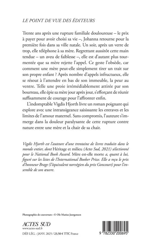 Trente ans après une rupture familiale douloureuse - le prix à payer pour avoir choisi sa vie -, Johanna retourne pour la première fois dans sa ville natale. Un soir, après un verre de trop, elle téléphone à sa mère. Regrettant aussitôt cette main tendue - un aveu de faiblesse -, elle est d'autant plus tourmentée que sa mère rejette l'appel. Ce geste l'obsède, car comment une mère peut- elle simplement tirer un trait sur son propre enfant ? Après nombre d'appels infructueux, elle se résout à l'attendre en bas de son immeuble, la peur au ventre. Telle une proie irrémédiablement attirée par son bourreau, elle épie sa mère jour après jour, s'efforçant de réunir suffisamment de courage pour l'affronter enfin. L'indomptable Vigdis Hjorth livre un roman poignant qui explore avec une intransigeance saisissante les entraves et les limites de l'amour maternel. Sans compromis, l'auteure s'immerge dans la douleur paralysante de cette rupture contre nature entre une mère et la chair de sa chair.