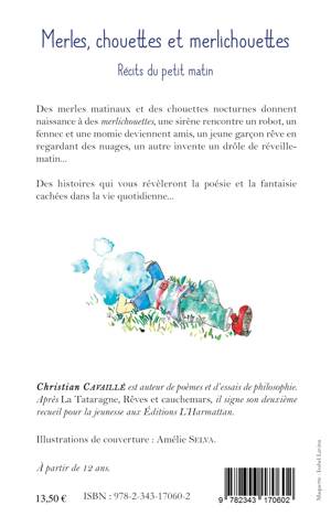 Des merles matinaux et des chouettes nocturnes donnent naissance à des merlichouettes, une sirène rencontre un robot, un fennec et une momie deviennent amis, un jeune garçon rêve en regardant des nuages, un autre invente un drôle de réveille-matin... Des histoires qui vous révèleront la poésie et la fantaisie cachées dans la vie quotidienne...
