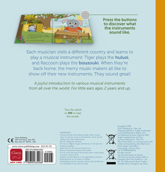 Each musician visits a different country and learns to play a musical instrument. Tiger plays the hulusi, and Raccoon plays the bouzouki. When they’re back home, the merry music makers all like to show off their new instruments. They sound great! A joyful introduction to various musical instruments from all over the world. For little ears ages 2 years and up.