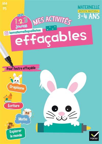 Cet ouvrage de Petite section est conçu par une professeure des écoles, Alissia Waeles, active sur les réseaux sociaux et connue sous le pseudonyme La Maternelle pailletée, @lamaternellepailletee. Les activités proposées sont ludiques et richement illustrées. Elles permettent à votre enfant de s’entrainer dans tous les domaines d’apprentissage de l’école maternelle : maths, graphisme, écriture et explorer le monde. Ce cahier s’utilise avec un feutre effaçable pour que votre enfant puisse se tromper, effacer, recommencer et prendre confiance en lui.