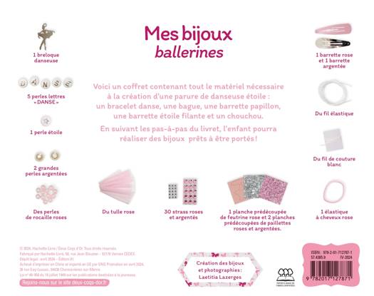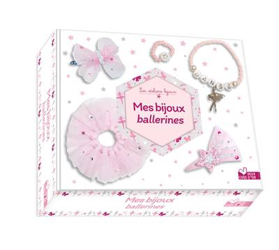 Voici un coffret contenant tout le matériel nécessaire à la création d'une parure de danseuse étoile : un bracelet danse, une bague, une barrette papillon, une barrette étoile filante et un chouchou. En suivant les pas-à-pas du livret, l'enfant pourra réaliser des bijoux prêts à être portés ! 1 breloque danseuse, 5 perles lettres "DANSE", 1 perle étoile, 2 grandes perles argentées, des perles de rocaille roses, du tulle rose, 30 strass roses et argentés, 1 planche prédécoupée de feutrine rose et 2 planches prédécoupées de paillettes roses et argentées, 1 barrette rose et 1 barrette argentée, du fil élastique, du fil de couture blanc, 1 élastique à cheveux rose.