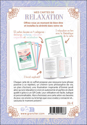 Chaque carte de ce coffret propose une ressource (une phrase positive à se répéter), un chemin (une philosophie de vie, un plan d'action), une illustration inspirante d’Emmà Landi ainsi qu’une relaxation à vivre en autonomie et parfois en étant guidé·e grâce à un QR Code. Leur utilisation est facile, ludique et personnalisable. Alors choisissez une carte selon vos besoins du jour, vos envies ou le temps que vous voulez y consacrer et… savourez le moment présent !