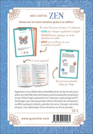 Restez zen en toute situation grâce aux 60 cartes de ce coffret ! Apprenez à vous libérer des contrariétés de la vie de tous les jours grâce aux bienfaits des techniques psychocorporelles proposées ici par Chloé Turgis, praticienne en hypnose, sophrologie et EFT. Aménagez-vous des pauses bien-être en fonction de vos besoins : souffler quelques instants, prendre du recul, changer votre état d’esprit, vous décharger d’une émotion ou d’une pensée...