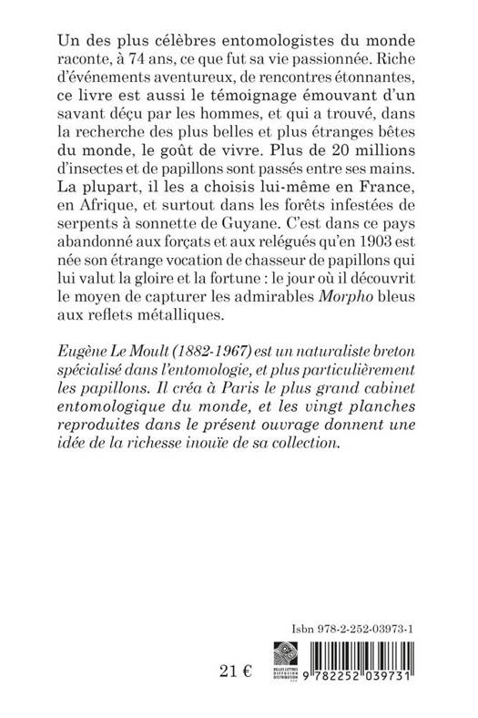 Un des plus celebres entomologistes du monde raconte, a 74 ans, ce que fut sa vie passionnee. Riche d'evenements aventureux, de rencontres etonnantes, ce livre est aussi le temoignage emouvant d'un savant decu par les hommes, et qui a trouve, dans la recherche des plus belles et plus etranges betes du monde, le gout de vivre. Plus de 20 millions d'insectes et de papillons sont passes entre ses mains. La plupart, il les a choisis lui-meme en France, en Afrique, et surtout dans les forets infestees de serpents a sonnette de Guyane. C'est dans ce pays abandonne aux forcats et aux relegues qu'en 1903 est nee son etrange vocation de chasseur de papillons qui lui valut la gloire et la fortune: le jour ou il decouvrit le moyen de capturer les admirables Morpho bleus aux reflets metalliques.