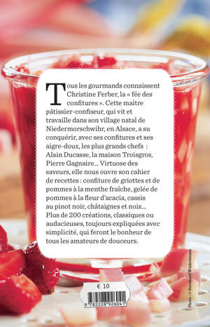 Tous les gourmands connaissent Christine Ferber, la "fée des confitures". Cette maître pâtissier-confiseur, qui vit et travaille dan s son village natal de Niedermorschwihr, en Alsace, a su conquérir, avec ses confitures et ses aigre-doux, les plus grands chefs : Alain Ducasse, la maison Troisgros, Pierre Gagnaire... Virtuose des saveurs, elle nous ouvre son cahier de recettes : confiture d e griottes et de pommes à la menthe fraîche, gelée de pommes à la fleur d'acacia, cassis au pinot noir, châtaignes et noix... Plus de 200 créations, classiques ou audacieuses, toujours expliquées avec simplicité, qui feront le bonheur de tous les amateurs de d ouceurs.
