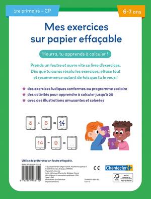 Hourra, tu apprends à calculer ! Prends un feutre normal ou effaçable et ouvre vite ce livre d'exercices. Dès que tu auras résolu les exercices, efface tout et recommence autant de fois que tu le veux ! - des exercices ludiques conformes au programme scolaire - des activités pour apprendre à calculer jusqu'à 20 - facilement effaçable avec un tissu humide - avec des illustrations amusantes et colorées