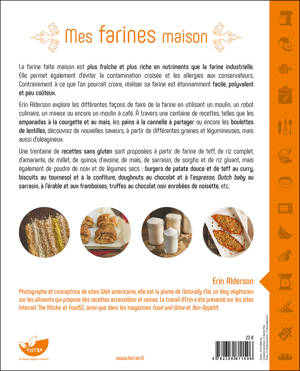 La farine faite maison est plus fraîche et plus riche en nutriments que la farine industrielle. Elle permet également d’éviter la contamination croisée et les allergies aux conservateurs. Contrairement à ce que l’on pourrait croire, réaliser sa farine est étonnamment facile, polyvalent et peu coûteux. Erin Alderson explore les différentes façons de faire de la farine en utilisant un moulin, un robot culinaire, un mixeur ou encore un moulin à café. À travers une centaine de recettes, telles que les empanadas à la courgette et au maïs, les pains à la cannelle à partager ou encore les boulettes de lentilles, découvrez de nouvelles saveurs, à partir de différentes graines et légumineuses, mais aussi d’oléagineux. Une trentaine de recettes sans gluten sont proposées à partir de farine de teff, de riz complet, d’amarante, de millet, de quinoa, d’avoine, de maïs, de sarrasin, de sorgho et de riz gluant, mais également de poudre de noix et de légumes secs : burgers de patate douce et de teff au curry, biscuits au tournesol et à la confiture, doughnuts au chocolat et à l’espresso, Dutch baby au sarrasin, à l’érable et aux framboises, truffes au chocolat noir enrobées de noisette, etc.