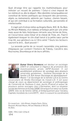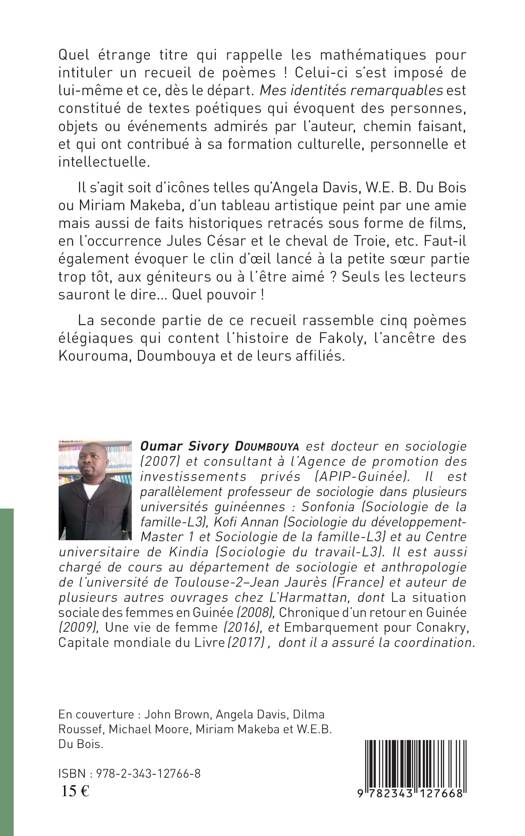 Mes identités remarquables est constitué de textes poétiques qui évoquent des personnes, objets ou événements admirés par l'auteur et qui ont contribué à sa formation culturelle, personnelle et intellectuelle. Il s'agit soit d'icônes telles qu'Angela Davis, W.E. B. du Bois ou Miriam Makeba, d'un tableau artistique peint par une amie mais aussi de faits historiques retracés sous forme de films.