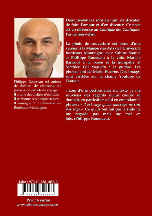 Deux personnes sont en train de discuter, de faire l'amour et d'en discuter. Ce texte est en référence au Cantique des Cantiques. Pas de lieu défini.
