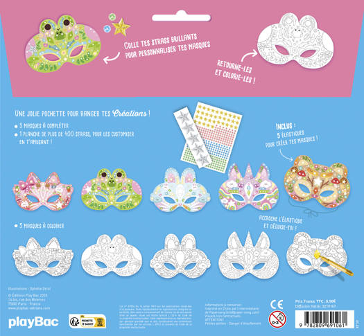 5 masques à décorer ou à colorier, une superbe planche de strass pour les personnaliser et une jolie pochette pour ranger tes créations.