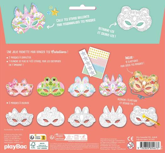 5 masques à décorer ou à colorier, une superbe planche de strass pour les personnaliser et une jolie pochette pour ranger tes créations.