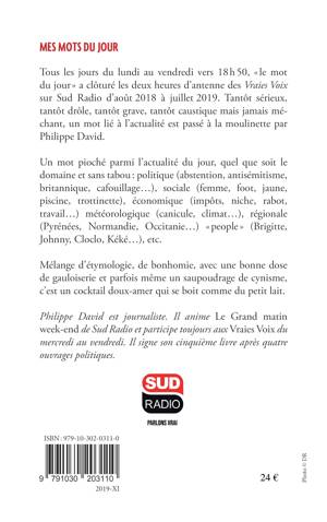 Tous les jours du lundi au vendredi vers 18 h 50, "le mot du jour" a clôturé les deux heures d'antenne des Vraies Voix sur Sud Radio d'août 2018 à juillet 2019. Tantôt sérieux, tantôt drôle, tantôt grave, tantôt caustique mais jamais méchant, un mot lié à l'actualité est passé à la moulinette par Philippe David. Un mot pioché parmi l'actualité du jour, quel que soit le domaine, et sans tabou : politique (abstention, antisémistisme, britannique, cafouillage...), sociale (femme, foot, jaune, piscine, trottinette), économique (impôts, niche, rabot, travail...), météorologique (canicule, climat...), régionale (Pyrénées, Normandie, Occitanie...), "people" (Brigitte, Johnny, Cloclo, Kéké...), etc. Mélange d'étymologie, de bonhomie, avec une bonne dose de gauloiserie et parfois même un saupoudrage de cynisme, c'est un cocktail doux-amer qui se boit comme du petit lait.