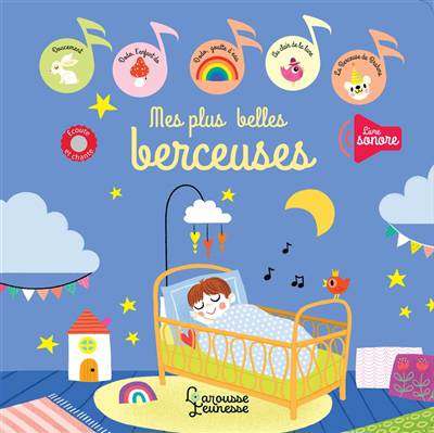 Cinq berceuses cultes pour les tout-petits : Doucement, Au clair de la lune, Dodo goutte d'eau, Dodo l'enfant Do. Sur chaque double-page, l’enfant découvre une célèbre comptine, illustrée par une grande image. Chaque texte de chant est accompagné d’une puce-son, signalée par une rondelle rouge « Écoute et chante » très visible, même par les plus petits.