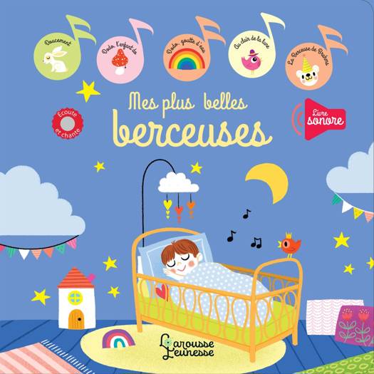Cinq berceuses cultes pour les tout-petits : Doucement, Au clair de la lune, Dodo goutte d'eau, Dodo l'enfant Do. Sur chaque double-page, l’enfant découvre une célèbre comptine, illustrée par une grande image. Chaque texte de chant est accompagné d’une puce-son, signalée par une rondelle rouge « Écoute et chante » très visible, même par les plus petits.