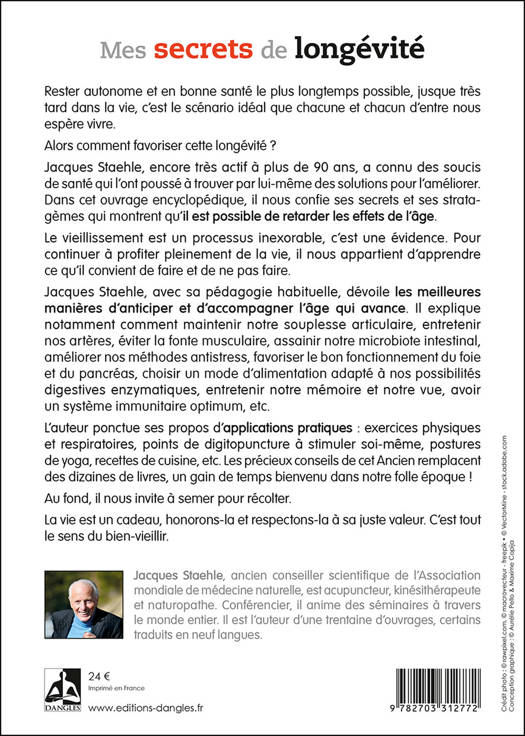 Rester longtemps autonome et en bonne santé, jusque très tard dans la vie, c'est le scénario idéal. Alors comment favoriser cette longévité ? Dans cet ouvrage encyclopédique, Jacques Staehle, encore très actif à plus de 90 ans, nous confie ses secrets et ses stratagèmes qui montrent qu'il est possible de retarder les effets du vieillissement. Il dévoile les meilleures manières d'anticiper et d'accompagner l'âge qui avance : comment maintenir notre souplesse articulaire, entretenir nos artères, éviter la fonte musculaire, assainir notre microbiote intestinal, favoriser le bon fonctionnement du foie et du pancréas, choisir un mode d'alimentation adapté, entretenir notre mémoire et notre vue, avoir un système immunitaire optimum, etc. L'auteur ponctue ses propos d'applications pratiques : exercices, points de digitopuncture à stimuler, recettes de cuisine, etc. La vie est un cadeau, honorons-la et respectons-la à sa juste valeur. C'est tout le sens du bien-vieillir.