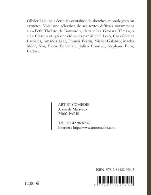 Olivier Lejeune a écrit des centaines de sketches, monologues ou saynètes. Voici une sélection de ses textes diffusés notamment au « Petit Théâtre de Bouvard », dans « Les Grosses Têtes », à « La Classe » et qui ont été joués par Michel Leeb, Chevallier et Laspalès, Amanda Lear, Francis Perrin, Michel Galabru, Macha Méril, Sim, Pierre Bellemare, Julien Courbet, Stéphane Bern, Carlos...